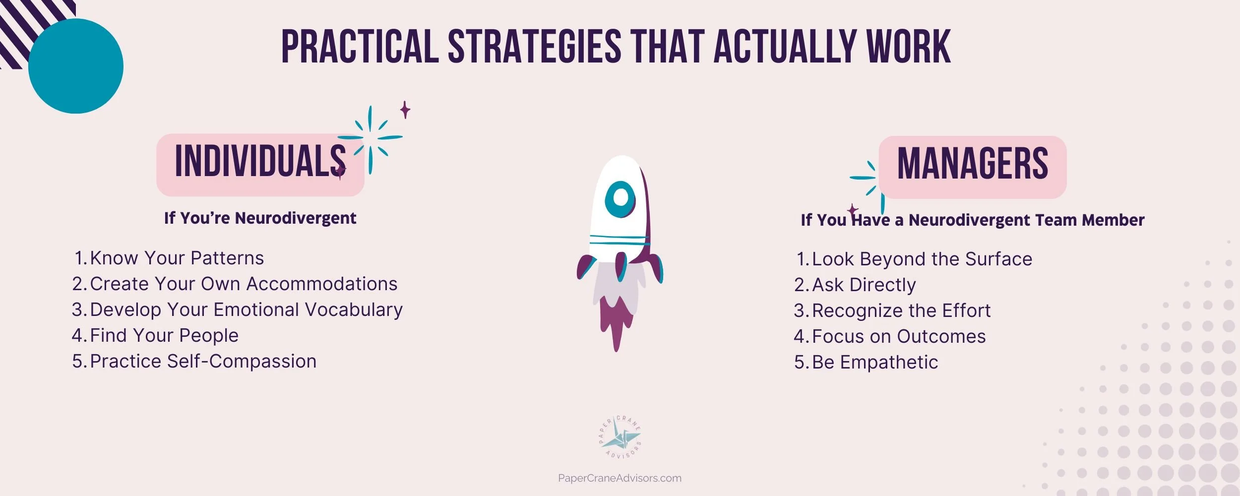 Recognize the effort: Acknowledge that navigating neurotypical workplace norms is additional labor for neurodivergent employees. This recognition alone can significantly improve job satisfaction and retention.